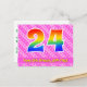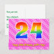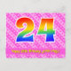 El frente de este diseño de tarjeta postal de cumpleaños feliz, amoroso y alegre presenta un gran número "24" con un patrón de gradiente de espectro de arcoíris, junto con el mensaje "Feliz cumpleaños 24", y un nombre de destinatario personalizable. La parte delantera también tiene un patrón alegre de corazones y rayas de color rosa oscuro y rosa claro. La parte trasera presenta un mensaje de saludo de cumpleaños personalizado, o quizás podría estar en blanco si se desea escribir un mensaje a mano en su lugar. Una tarjeta postal de cumpleaños personalizable como esta podría ser una forma divertida de celebrar el cumpleaños número veinticuatro de alguien. Las tarjetas postales como esta también podrían usarse para invitar a los invitados a una celebración de cumpleaños o fiesta que se organice para alguien que está cumpliendo 24 años.