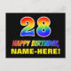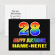 La parte delantera de este alegre, colorido y divertido diseño de postales con temática de cumpleaños cuenta con un gran número "28" y el mensaje "FELIZ CUMPLEAÑOS", ambos con un coloreado de patrones inspirado en el gradiente del espectro del arcoiris, junto con un audaz nombre de receptor de personalizable amarillo. La parte delantera también tiene un fondo de color negro claro. La parte posterior de la tarjeta postal contiene un mensaje de saludo de cumpleaños modificable, o tal vez podría borrarse y dejarse en blanco si se va a escribir un mensaje a mano. Una colorida postal de cumpleaños personalizada como esta podría ser una manera divertida de celebrar el 28 cumpleaños de alguien. [~Z0000474]