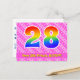 El frente de este diseño de tarjeta postal con temática de cumpleaños alegre y feliz presenta un gran número "28" con un patrón inspirado en el gradiente del espectro del arcoíris, junto con el mensaje "Feliz cumpleaños 28" y un nombre de destinatario personalizable. La parte delantera presenta además un patrón alegre de formas y rayas de corazones de color rosa oscuro y rosa claro. La parte trasera presenta un mensaje de felicitación de cumpleaños personalizable, o quizás podría estar en blanco si se desea escribir un mensaje a mano. Una tarjeta postal de cumpleaños personalizable como esta podría ser una forma divertida de celebrar el cumpleaños número veintiocho de alguien. Las tarjetas postales como esta también podrían utilizarse para invitar a los invitados a una celebración de cumpleaños que se celebra para alguien que cumple 28 años.