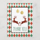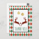 Una tarjeta postal de Navidad que dice "Gracias" en la parte delantera y tiene un mensaje personalizado en la parte posterior. Diseñado con una ilustración de 2 ciervos de Navidad saltando. Los ciervos están hechos de cuadros de leñador rojos y negros, con un pequeño corazón entre ellos. Decoraciones navideñas de purpurina dorada falsa cuelgan de la parte superior. El fondo es un patrón argyle rojo y verde.