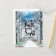La postal cristiana de las escrituras inspiradoras muestra una simple pintura acuarela de una pasarela rodeada de árboles. Presenta la Biblia Verse 2 Corinthians 5:7, "Caminamos por la fe no por la vista". La oración del saludo puede ser personalizada o borrada para un mensaje escrito a mano.