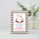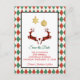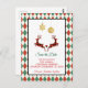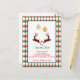Guarda la postal de Navidades de fecha con un ilustracion de 2 Navidades de ciervos saltando. Los ciervos están hechos de leñadores rojos y negros, con un poco de corazón entre ellos. Las decoraciones navideñas falsas purpurinas de oro cuelgan desde arriba. El fondo es un patrón de argyle rojo y verde.