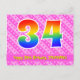 El frente de este diseño de tarjeta postal de cumpleaños animado, feliz y cariñoso presenta un gran número "34" con un patrón inspirado en gradiente de espectro de arcoíris. También presenta el mensaje "Feliz cumpleaños 34" y un nombre de destinatario personalizado. El frente también presenta un patrón alegre a rayas rosa claro y rosa oscuro con formas de corazón. La parte trasera presenta un mensaje de saludo de cumpleaños personalizable, o podría estar despejado y dejado en blanco si se va a escribir un mensaje a mano en su lugar. Una tarjeta postal de cumpleaños personalizada como esta podría ser una forma divertida de celebrar el cumpleaños número treinta y cuatro de alguien. Las tarjetas postales como esta también podrían usarse para invitar a los invitados a una fiesta de cumpleaños o celebración que se organice para alguien que cumple 34 años. [~Z0000449]