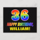 La parte delantera de este colorido, divertido y alegre diseño de postal temático de cumpleaños incluye un gran número de "36" y el mensaje "FELIZ CUMPLEAÑOS", ambos coloreados con un patrón inspirado en el gradiente del espectro del arcoiris, junto con un audaz nombre del destinatario del personalizable amarillo. La parte delantera también tiene un fondo de color negro claro. En la parte posterior de la tarjeta postal aparece un mensaje de saludo de cumpleaños de personalizable, o tal vez se podría borrar y dejar en blanco si se va a escribir un mensaje a mano. Una postal de cumpleaños personalizada y vibrante como esta podría ser una manera divertida de enviar un mensaje en celebración del 36 cumpleaños de alguien. [~Z0000474]