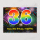 El frente de este diseño de tarjeta postal temática de cumpleaños emocionante, colorido y divertido presenta un gran número "36" con un patrón inspirado en gradiente de espectro de arcoíris. También presenta el mensaje "Feliz cumpleaños 36" y un nombre de destinatario personalizable. El frente también presenta un patrón de fondo de fuegos artificiales de celebración que estallan colorido y vibrante. La parte trasera presenta un mensaje de saludo de cumpleaños personalizable, o quizás podría estar despejado y dejado en blanco si se va a escribir un mensaje a mano en su lugar. Una tarjeta postal de cumpleaños personalizable como esta podría ser una forma divertida de reconocer el cumpleaños número treinta y seis de alguien. Las tarjetas postales como esta también podrían usarse para invitar a los invitados a una celebración de cumpleaños o fiesta que se celebra para alguien que cumple 36 años.