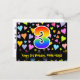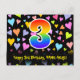 El frente de este diseño de tarjeta postal temática de cumpleaños emocionante, divertido y colorido presenta un gran número "3" con un patrón inspirado en el gradiente del espectro del arcoíris, junto con el mensaje "Feliz cumpleaños número 3", y un nombre de destinatario personalizado. La parte delantera presenta además un patrón de fondo vibrante y colorido con corazones amorosos de diferentes tamaños. La parte trasera presenta un mensaje de saludo de cumpleaños personalizado, o quizás podría estar en blanco si se desea escribir un mensaje a mano en su lugar. Una tarjeta postal de cumpleaños personalizable como esta podría ser una forma divertida de reconocer el tercer cumpleaños de alguien. Las tarjetas postales como esta también podrían utilizarse para invitar a los invitados a una celebración de cumpleaños que se celebra para alguien que cumple 3 años.