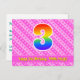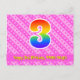 El frente de este diseño de tarjeta postal temática de cumpleaños feliz, alegre y animado presenta un número grande "3" con un patrón inspirado en el gradiente del espectro del arcoíris, junto con el mensaje "Feliz cumpleaños número 3", y un nombre de destinatario personalizable. La parte delantera también tiene un patrón de rayas felices de color rosa oscuro y rosa claro que contiene formas de corazón. La parte trasera presenta un mensaje de felicitación de cumpleaños editable, o quizás podría borrarse y dejarse en blanco si se desea escribir un mensaje a mano. Una tarjeta postal de cumpleaños personalizada como esta podría ser una forma divertida de enviar un mensaje para celebrar el tercer cumpleaños de alguien. Las tarjetas postales como esta también podrían usarse para invitar a los invitados a una celebración de cumpleaños o fiesta que se organice para alguien que cumple 3 años.