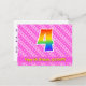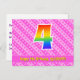 El frente de este diseño de tarjeta postal temática de cumpleaños feliz, amoroso y divertido presenta un gran número "4" con un patrón inspirado en gradiente de espectro de arcoíris. También presenta el mensaje "Feliz cumpleaños número 4", y un nombre de destinatario personalizado. El frente también presenta formas de corazón felices de color rosa claro y rosa oscuro y un patrón de rayas. La parte trasera presenta un mensaje de saludo de cumpleaños personalizado, o quizás podría estar en blanco si se desea escribir un mensaje a mano en su lugar. Una tarjeta postal de cumpleaños personalizable como esta podría ser una forma divertida de reconocer el cuarto cumpleaños de alguien. Las tarjetas postales como esta también podrían usarse para invitar a los invitados a una celebración de cumpleaños o fiesta que se celebra para alguien que cumple 4 años.
