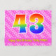 El frente de este diseño de tarjeta postal de cumpleaños divertido, alegre y animado presenta un gran número "43" con un patrón de gradiente de espectro de arcoíris. También presenta el mensaje "Feliz cumpleaños 43" y un nombre de destinatario editable. La parte delantera también tiene un patrón alegre de formas de corazón y rayas de color rosa oscuro y rosa claro. La parte trasera presenta un mensaje de saludo de cumpleaños editable, o quizás podría borrarse y dejarse en blanco si se desea escribir un mensaje a mano. Una tarjeta postal de cumpleaños personalizable como esta podría ser una forma divertida de enviar un mensaje para celebrar el cumpleaños número cuarenta y tres de alguien. Las tarjetas postales como esta también podrían usarse para invitar a los invitados a una fiesta de cumpleaños que se celebra para alguien que cumple 43 años. [~Z0000449]