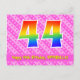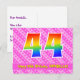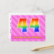 El frente de este diseño de tarjeta postal de cumpleaños divertida y alegre presenta un número grande "44" con un patrón de gradiente de espectro de arcoíris. También presenta el mensaje "Feliz cumpleaños 44" y un nombre de destinatario personalizado. La parte delantera también tiene un patrón alegre de rayas rosadas claras y oscuras con formas de corazón. La parte trasera presenta un mensaje de saludo de cumpleaños personalizado, o quizás podría estar en blanco si se desea escribir un mensaje a mano. Una tarjeta postal de cumpleaños personalizada como esta podría ser una forma divertida de celebrar el cumpleaños número cuarenta y cuatro de alguien. Tarjetas postales como esta también podrían usarse para invitar a los invitados a una celebración de cumpleaños que se celebra para alguien que está cumpliendo 44 años.