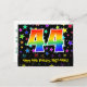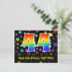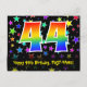 El frente de este diseño de tarjeta postal temática de cumpleaños emocionante, colorido y divertido presenta un gran número "44" con un patrón inspirado en el gradiente del espectro del arcoíris, junto con el mensaje "Feliz cumpleaños 44" y el nombre del destinatario personalizado. La parte delantera también tiene un patrón de fondo vibrante y colorido que presenta formas de estrellas de diferentes tamaños. La parte posterior presenta un mensaje de saludo de cumpleaños personalizado, o quizás podría estar en blanco si se desea escribir un mensaje a mano en su lugar. Una tarjeta postal de cumpleaños personalizable como esta podría ser una forma divertida de celebrar el cumpleaños número cuarenta y cuatro de alguien. Tarjetas postales como esta también podrían usarse para invitar a los invitados a una fiesta de cumpleaños o celebración que se organice para alguien que cumple 44 años.