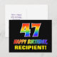 La parte delantera de este colorido, alegre y divertido diseño de postales con temática de cumpleaños presenta un gran número "47" y el mensaje "FELIZ CUMPLEAÑOS", ambos coloreados con un patrón inspirado en el gradiente del espectro del arcoiris, junto con un audaz nombre del destinatario del personalizado amarillo. El frontal también presenta un fondo de color negro mínimo. La parte posterior de la tarjeta postal tiene un mensaje de bienvenida de cumpleaños de personalizado, o tal vez podría ser borrado y dejado en blanco si se va a escribir un mensaje a mano. Una tarjeta postal vibrante de cumpleaños de personalizable como esta podría ser una manera divertida de celebrar el 47 cumpleaños de alguien. [~Z0000474]