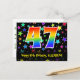 El frente de este divertido, emocionante y colorido diseño de tarjeta postal temática de cumpleaños presenta un gran número "47" con un patrón inspirado en el gradiente del espectro del arcoíris, junto con el mensaje "Feliz cumpleaños 47" y un nombre de destinatario personalizable. La parte delantera también presenta un patrón colorido y vibrante de formas de estrellas. La parte trasera presenta un mensaje de saludo de cumpleaños editable, o quizás podría borrarse y dejarse en blanco si se desea escribir un mensaje a mano. Una tarjeta postal de cumpleaños personalizable como esta podría ser una forma divertida de enviar un mensaje para celebrar el cumpleaños número cuarenta y siete de alguien. Tarjetas postales como esta también podrían usarse para invitar a los invitados a una celebración de cumpleaños que se celebra para alguien que cumple 47 años. [~Z0000447]