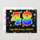 El frente de este diseño de tarjeta postal temática de cumpleaños emocionante, divertida y colorida presenta un gran número "48" con un patrón inspirado en gradiente de espectro de arcoíris. También presenta el mensaje "Feliz cumpleaños 48" y un nombre de destinatario personalizable. La parte delantera también cuenta con un fondo vibrante y colorido con un patrón de formas de estrellas. La parte trasera presenta un mensaje de saludo de cumpleaños personalizado, o quizás podría estar en blanco si se desea escribir un mensaje a mano en su lugar. Una tarjeta postal de cumpleaños como esta podría ser una forma divertida de enviar deseos de cumpleaños a alguien que está celebrando su cumpleaños número cuarenta y ocho. Tarjetas postales como esta también podrían utilizarse para invitar a los invitados a una fiesta de cumpleaños o celebración que se organice para alguien que cumple 48 años.