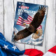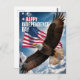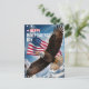 4 de julio Feliz Día de la Independencia con tarjeta postal. Un majestuoso águila calva lanzando la bandera estadounidense en el fondo simboliza la libertad y la fuerza. Los saludos en la parte de atrás, como se desee.