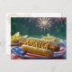 A hot dog with the word 'America' written in mustard rests on a star-spangled plate as fireworks light up the night sky in the background.