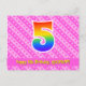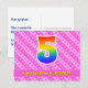 La parte delantera de este diseño de tarjeta postal con tema de cumpleaños alegre, cariñoso y feliz presenta un gran número "5" con un patrón de gradiente de espectro de arcoíris, junto con el mensaje "Feliz cumpleaños número 5", y un nombre de destinatario personalizado. La parte delantera también tiene un patrón alegre a rayas de color rosa oscuro y rosa claro con formas de corazón. La parte trasera presenta un mensaje de felicitación de cumpleaños editable, o quizás podría borrarse y dejarse en blanco si se desea escribir un mensaje a mano. Una tarjeta postal de cumpleaños personalizada como esta podría ser una forma divertida de reconocer el quinto cumpleaños de alguien. Tarjetas postales como esta también podrían usarse para invitar a invitados a una fiesta de cumpleaños o celebración que se organice para alguien que cumple 5 años. [~Z0000449]