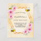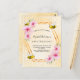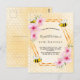 Elegante, divertida, invitación de verano a los 50 años. Fondo amarillo y blanco con un patrón de peine de miel. Con un marco geométrico de oro falso. Decorado con flores tropicales rosadas, hibiscos y abejas con burbujas. El nombre está escrito con una escritura de estilo moderno con letras a mano. Cartas negras. Perfecto para un fiesta de té de verano en un jardín, patio trasero.