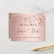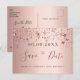 Una tarjeta femenina y glamorosa Salven la Fecha para una fiesta de 50 años de cumpleaños de 50 años. Un fondo femenino rosa, dorado rosa, de aspecto metálico, decorado con falsas estrellas brillantes de oro rosa. Plantillas para una fecha y su texto. Letras de color oro rosa oscuro. El texto: Save the Date se escribe con un gran guión de estilo escrito a mano. Fondo de oro rosa. Plantillas para los detalles del fiesta. Texto negro.