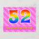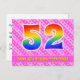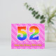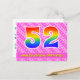 El frente de este diseño de tarjeta postal de cumpleaños animado, divertido y feliz presenta un gran número "52" con un patrón de gradiente de espectro de arcoíris, junto con el mensaje "Feliz cumpleaños 52", y un nombre de destinatario editable. El frente tiene además un patrón alegre a rayas rosa oscuro y rosa claro con formas de corazón. La parte posterior presenta un mensaje de saludo de cumpleaños personalizado, o quizás podría estar despejado y dejado en blanco si se va a escribir un mensaje a mano en su lugar. Una tarjeta postal de cumpleaños personalizable como esta podría ser una forma divertida de celebrar el cumpleaños número cincuenta y dos de alguien. Las tarjetas postales como esta también podrían usarse para invitar a los invitados a una fiesta de cumpleaños o celebración que se organice para alguien que cumpla 52 años.