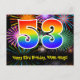 El frente de este divertido, colorido y emocionante diseño de postal temático de cumpleaños incluye un gran número de "53" con un patrón inspirado en el gradiente del espectro arcoiris, junto con el mensaje "Feliz cumpleaños número 53", y un nombre de destinatario personalizado. El frente cuenta además con un vibrante y colorido patrón de fondo inspirado en el aspecto de los fuegos artificiales de celebración reventando. La parte posterior presenta un mensaje de saludo de cumpleaños modificable, o tal vez podría borrarse y dejarse en blanco si se va a escribir un mensaje a mano. Una postal de cumpleaños como esta podría ser una manera divertida de enviar deseos de cumpleaños a alguien que esté celebrando su cincuenta tercer cumpleaños. Postales como esta también podrían ser usadas para invitar a invitados a una fiesta de cumpleaños para alguien que cumple 53 años. [~Z0000446]