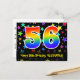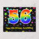 El frente de este diseño de tarjeta postal temática de cumpleaños emocionante, colorida y divertida presenta un gran número "56" con un patrón inspirado en gradiente de espectro de arcoíris. También presenta el mensaje "Feliz cumpleaños 56" y un nombre de destinatario personalizado. La parte delantera también tiene un fondo colorido y vibrante con un patrón de formas de estrellas. La parte posterior presenta un mensaje de saludo de cumpleaños personalizado, o quizás podría estar en blanco si se desea escribir un mensaje a mano. Una tarjeta postal de cumpleaños personalizada como esta podría ser una forma divertida de enviar un mensaje que celebre el cumpleaños número cincuenta y seis de alguien. Tarjetas postales como esta también podrían usarse para invitar a los invitados a una fiesta de cumpleaños o celebración que se organice para alguien que cumple 56 años.