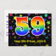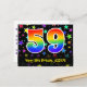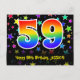 El frente de este diseño de tarjeta postal temática de cumpleaños emocionante, colorido y divertido presenta un gran número "59" con un patrón inspirado en el gradiente del espectro del arcoíris, junto con el mensaje "Feliz cumpleaños 59", y un nombre de destinatario personalizable. La parte delantera presenta además un patrón de fondo de formas de estrellas coloridas y vibrantes. La parte posterior presenta un mensaje de saludo de cumpleaños personalizado, o quizás podría estar en blanco si se va a escribir un mensaje a mano en su lugar. Una tarjeta postal de cumpleaños personalizada como esta podría ser una forma divertida de celebrar el cumpleaños número cincuenta y nueve de alguien. Las tarjetas postales como esta también podrían usarse para invitar a los invitados a una fiesta de cumpleaños o celebración que se organice para alguien que cumple 59 años.