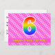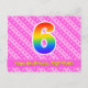 El frente de este diseño de tarjeta postal temática de cumpleaños feliz, animado y divertido presenta un gran número "6" con un patrón inspirado en gradiente de espectro de arcoíris, junto con el mensaje "Feliz cumpleaños 6", y un nombre de destinatario personalizable. La parte delantera tiene además un patrón alegre de formas de corazón y rayas de color rosa claro y rosa oscuro. La parte trasera presenta un mensaje de saludo de cumpleaños editable, o quizás podría borrarse y dejarse en blanco si se desea escribir un mensaje a mano. Una tarjeta postal de cumpleaños personalizada como esta podría ser una forma divertida de enviar un mensaje para celebrar el sexto cumpleaños de alguien. Las tarjetas postales como esta también podrían usarse para invitar a los invitados a una celebración de cumpleaños o fiesta que se organice para alguien que cumpla 6 años.