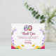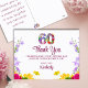 floral de 60 años gracias a la moderna fiesta Postcard de 60 años. Muestra tu gratitud con estilo con esta elegante tarjeta de agradecimiento por su 60 cumpleaños con vibrantes acentos florales y un mensaje sincero. La parte delantera de la tarjeta muestra un gran "60" en un colorido diseño floral y las palabras "Gracias" en un guión en negrita, seguido de un mensaje de personalizable. En la parte trasera hay una conmovedora nota de aprecio por celebrar un hito de 60 años maravillosos llenos de amor, risas y recuerdos. Esta tarjeta es la manera perfecta de expresar su agradecimiento por asistir a su día especial y por los generosos regalos recibidos. Personalice fácilmente esta tarjeta de agradecimiento para reflejar sus propios sentimientos únicos. ¡Disfrútalo!
