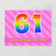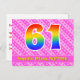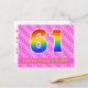 El frente de este diseño de tarjeta postal de cumpleaños animado, feliz y cariñoso presenta un gran número "61" con un patrón inspirado en el gradiente del espectro del arcoíris, junto con el mensaje "Feliz cumpleaños 61", y un nombre de destinatario personalizado. La parte delantera presenta además un patrón alegre de rayas rosadas claras y oscuras con formas de corazón. La parte trasera presenta un mensaje de saludo de cumpleaños personalizado, o quizás podría estar en blanco si se desea escribir un mensaje a mano. Una tarjeta postal de cumpleaños personalizada como esta podría ser una forma divertida de celebrar el cumpleaños número sesenta y uno de alguien. Tarjetas postales como esta también podrían usarse para invitar a invitados a una fiesta de cumpleaños que se celebra para alguien que cumple 61 años.