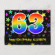El frente de este diseño de tarjeta postal temática de cumpleaños emocionante, divertida y colorida presenta un gran número "63" con un patrón inspirado en gradiente de espectro de arcoíris. También presenta el mensaje "Feliz cumpleaños 63" y un nombre de destinatario personalizable. La parte delantera también cuenta con un fondo colorido y vibrante con un patrón de formas de estrellas. La parte trasera presenta un mensaje de saludo de cumpleaños personalizable, o podría estar en blanco si se desea escribir un mensaje a mano. Una tarjeta postal de cumpleaños personalizada como esta podría ser una forma divertida de enviar un mensaje para celebrar el cumpleaños número sesenta y tres de alguien. Tarjetas postales como esta también podrían usarse para invitar a invitados a una celebración de cumpleaños que se celebra para alguien que cumple 63 años.