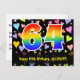 El frente de este divertido, afectuoso y colorido diseño de tarjeta postal de cumpleaños presenta un gran número "64" con un patrón de gradiente de espectro de arcoíris. También presenta el mensaje "Feliz cumpleaños 64" y un nombre de destinatario personalizable. La parte delantera también tiene un colorido y vibrante patrón de fondo de formas de corazón afectuosas. La parte trasera presenta un mensaje de saludo de cumpleaños personalizable, o quizás podría estar despejado y dejado en blanco si se va a escribir un mensaje a mano en su lugar. Una tarjeta postal de cumpleaños personalizada como esta podría ser una forma divertida de celebrar el cumpleaños número sesenta y cuatro de alguien. Las tarjetas postales como esta también podrían utilizarse para invitar a los invitados a una fiesta de cumpleaños o celebración que se organice para alguien que cumple 64 años. [~Z0000448]