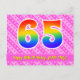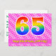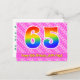 El frente de este diseño de tarjeta postal de cumpleaños alegre, cariñoso y divertido presenta un gran número "65" con un patrón de gradiente de espectro de arcoíris, junto con el mensaje "Feliz cumpleaños 65", y un nombre de destinatario personalizado. La parte delantera tiene además un alegre patrón de corazones y rayas de color rosa oscuro y rosa claro. La parte trasera incluye un mensaje de felicitación de cumpleaños personalizable, o quizás podría estar en blanco si se desea escribir un mensaje a mano. Una tarjeta postal de cumpleaños personalizable como esta podría ser una forma divertida de enviar un mensaje para celebrar el cumpleaños número sesenta y cinco de alguien. Tarjetas postales como esta también podrían usarse para invitar a invitados a una fiesta de cumpleaños que se celebra para alguien que cumple 65 años. [~Z0000449]