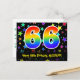 El frente de este divertido, emocionante y colorido diseño de tarjeta postal de cumpleaños presenta un gran número "66" con un patrón de gradiente de espectro de arcoíris. También presenta el mensaje "Feliz cumpleaños 66", y un nombre de destinatario personalizado. La parte delantera también cuenta con un patrón vibrante y colorido de formas de estrellas. La parte posterior presenta un mensaje de saludo de cumpleaños personalizado, o quizás podría estar en blanco si se desea escribir un mensaje a mano en su lugar. Una tarjeta postal de cumpleaños personalizable como esta podría ser una forma divertida de reconocer el cumpleaños número sesenta y seis de alguien. Las tarjetas postales como esta también podrían utilizarse para invitar a los invitados a una fiesta de cumpleaños que se celebra para alguien que cumple 66 años.