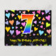 El frente de este diseño de tarjeta postal temática de cumpleaños colorido, emocionante y divertido presenta un número grande "7" con un patrón de gradiente de espectro de arcoíris. También presenta el mensaje "Feliz cumpleaños número 7", y un nombre de destinatario editable. La parte delantera también cuenta con un patrón de fondo vibrante y colorido que presenta formas de corazón amorosas de diferentes tamaños. La parte trasera presenta un mensaje de saludo de cumpleaños personalizado, o quizás podría estar despejado y dejado en blanco si se va a escribir un mensaje a mano en su lugar. Una tarjeta postal de cumpleaños personalizable como esta podría ser una forma divertida de reconocer el séptimo cumpleaños de alguien. Las tarjetas postales como esta también podrían utilizarse para invitar a los invitados a una celebración de cumpleaños o fiesta que se celebra para alguien que cumple 7 años.