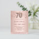 Una invitación moderna, elegante y glamurosa para una fiesta de cumpleaños número 70. Un fondo falso de aspecto metálico de oro rosa con estrellas de oro subió y de goteo rosado y una banda purpurina. El nombre está escrito con un guión moderno de estilo con letras de color rosa oscuro y dorado. Personalice y agregue los detalles de su fiesta. El número 70 se escribe con un tipo de letra, guión. Parte posterior: fondo dorado rosa, diseño postal. Sugerencia: Si no desea que se vea como una postal, haga clic en personalizar, vaya a la parte posterior y quite el separador y el sello postal.