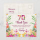 Envíe una cálida apreciación después de un cumpleaños histórico con esta elegante postal floral. Con flores de acuarela vibrantes sobre un fondo de lino suave con un audaz "70", este diseño de personalizable es la manera perfecta de agradecer a los huéspedes y seres queridos. ¡Disfrútalo!