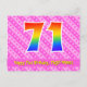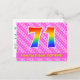 El frente de este diseño de tarjeta postal temática de cumpleaños divertida, alegre y animada presenta un gran número "71" con un patrón de gradiente de espectro de arcoíris, junto con el mensaje "Feliz cumpleaños 71", y un nombre de destinatario personalizado. La parte delantera tiene además un patrón de rayas rosa claro y rosa oscuro con formas de corazón. La parte trasera presenta un mensaje de saludo de cumpleaños personalizado, o quizás podría estar en blanco si se desea escribir un mensaje a mano. Una tarjeta postal de cumpleaños personalizada como esta podría ser una forma divertida de enviar un mensaje en celebración del cumpleaños número setenta y uno de alguien. Tarjetas postales como esta también podrían usarse para invitar a los invitados a una celebración de cumpleaños o fiesta que se organice para alguien que cumple 71 años. [~Z0000449]