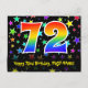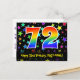 El frente de este diseño de tarjeta postal temática de cumpleaños emocionante, colorido y divertido presenta un gran número "72" con un patrón de gradiente de espectro de arcoíris, junto con el mensaje "Feliz cumpleaños 72", y un nombre de destinatario editable. La parte delantera presenta además un vibrante y colorido patrón de fondo con formas de estrellas. La parte posterior presenta un mensaje de saludo de cumpleaños personalizable, o quizás podría estar despejado y dejado en blanco si se desea escribir un mensaje a mano. Una tarjeta postal de cumpleaños personalizada como esta podría ser una forma divertida de enviar un mensaje para celebrar el cumpleaños número setenta y dos de alguien. Tarjetas postales como esta también podrían utilizarse para invitar a los invitados a una fiesta de cumpleaños o celebración que se organice para alguien que cumple 72 años.