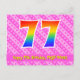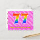 El frente de este diseño de tarjeta postal de cumpleaños alegre, animado y cariñoso presenta un gran número "77" con un patrón de gradiente de espectro de arcoíris. También presenta el mensaje "Feliz cumpleaños 77" y un nombre de destinatario editable. La parte delantera también presenta un patrón alegre de formas de corazón y rayas de color rosa oscuro y rosa claro. La parte trasera presenta un mensaje de saludo de cumpleaños editable, o quizás podría borrarse y dejarse en blanco si se desea escribir un mensaje a mano. Una tarjeta postal de cumpleaños personalizada como esta podría ser una forma divertida de celebrar el cumpleaños número setenta y siete de alguien. Tarjetas postales como esta también podrían usarse para invitar a invitados a una fiesta de cumpleaños o celebración que se organice para alguien que cumple 77 años. [~Z0000449]