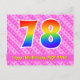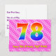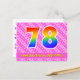 El frente de esta divertida tarjeta de cumpleaños presenta un gran número "78" con un patrón inspirado en el gradiente del espectro del arcoíris, junto con el mensaje "Feliz cumpleaños 78", y un nombre de destinatario personalizable. El frente también presenta un patrón de rayas rosa claro y rosa oscuro que contiene formas de corazón. La parte posterior presenta un mensaje de saludo de cumpleaños personalizado, o quizás podría estar en blanco si se desea escribir un mensaje a mano. Una tarjeta postal de cumpleaños personalizable como esta podría ser una forma divertida de enviar un mensaje para celebrar el cumpleaños número setenta y ocho de alguien. Tarjetas postales como esta también podrían usarse para invitar a invitados a una celebración de cumpleaños que se celebra para alguien que cumple 78 años. [~Z0000449]