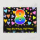 El frente de este diseño de tarjeta postal colorido, emocionante y divertido con tema de cumpleaños presenta un gran número "8" con un patrón inspirado en el gradiente del espectro del arcoíris, junto con el mensaje "Feliz cumpleaños número 8", y un nombre de destinatario personalizado. La parte delantera tiene además un patrón vibrante y colorido de corazones cariñosos. La parte trasera presenta un mensaje de saludo de cumpleaños personalizado, o quizás podría estar en blanco si se desea escribir un mensaje a mano. Una tarjeta postal de cumpleaños personalizable como esta podría ser una forma divertida de celebrar el octavo cumpleaños de alguien. Las tarjetas postales como esta también podrían usarse para invitar a los invitados a una fiesta de cumpleaños que se celebra para alguien que cumple 8 años. [~Z0000448]