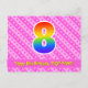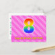 El frente de este diseño de tarjeta postal de cumpleaños alegre y feliz presenta un gran número "8" con un patrón de gradiente de espectro de arcoíris. También presenta el mensaje "Feliz cumpleaños número 8" y un nombre de destinatario personalizado. La parte frontal también tiene un patrón alegre de corazones y rayas de color rosa claro y rosa oscuro. La parte trasera presenta un mensaje de saludo de cumpleaños personalizado, o quizás podría estar en blanco si se desea escribir un mensaje a mano. Una tarjeta postal de cumpleaños personalizable como esta podría ser una forma divertida de reconocer el octavo cumpleaños de alguien. Las tarjetas postales como esta también podrían usarse para invitar a los invitados a una celebración de cumpleaños o fiesta que se organice para alguien que cumpla 8 años.