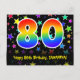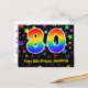 El frente de este divertido, emocionante y colorido diseño de tarjeta postal temática de cumpleaños presenta un gran número "80" con un patrón inspirado en gradiente de espectro de arcoíris. También presenta el mensaje "Feliz cumpleaños 80" y un nombre de destinatario personalizado. El frente también presenta un fondo vibrante y colorido con un patrón de formas de estrellas. La parte trasera presenta un mensaje de saludo de cumpleaños personalizado, o quizás podría estar en blanco si se desea escribir un mensaje a mano en su lugar. Una tarjeta postal de cumpleaños como esta podría ser una forma divertida de enviar deseos de cumpleaños a alguien que está celebrando su cumpleaños número ochenta. Tarjetas postales como esta también podrían usarse para invitar a invitados a una fiesta de cumpleaños o celebración que se organice para alguien que cumple 80 años.