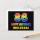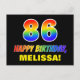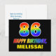 La parte delantera de este alegre, colorido y divertido diseño de postal de cumpleaños cuenta con un gran número "86" y el mensaje "FELIZ CUMPLEAÑOS", ambos coloreados con un patrón inspirado en el gradiente del espectro del arcoiris, junto con un audaz nombre del destinatario del personalizado amarillo. El frente también tiene un fondo sencillo, mínimo, de color negro. La parte posterior de la tarjeta postal tiene un mensaje de saludo de cumpleaños modificable, o tal vez podría ser borrado y dejado en blanco si se va a escribir un mensaje a mano. Una colorida postal de cumpleaños personalizada como esta podría ser una manera divertida de reconocer el 86º cumpleaños de alguien. [~Z0000474]