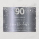 Un elegante Save the Date para una fiesta de cumpleaños número 90. Un fondo moderno de imitación metálica plateada, decorado con un falso purpurina. Personalice y agregue una fecha y un nombre/edad. El texto: Save the Date se escribe con un gran guión de estilo escrito a mano. Número 90 con un tipo de letra de estilo globo. Sugerencia: Si no desea que se vea como una postal, haga clic en personalizar, vaya a la parte posterior y quite el separador y el sello postal.
