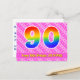 El frente de este diseño de tarjeta postal de cumpleaños divertido, animado y cariñoso presenta un gran número "90" con un patrón inspirado en el gradiente del espectro del arcoíris, junto con el mensaje "Feliz cumpleaños 90", y un nombre de destinatario editable. La parte delantera tiene además un alegre patrón a rayas rosa claro y rosa oscuro con formas de corazón. La parte posterior presenta un mensaje de saludo de cumpleaños personalizado, o quizás podría estar despejado y dejado en blanco si se desea escribir un mensaje a mano. Una tarjeta postal de cumpleaños personalizada como esta podría ser una forma divertida de enviar un mensaje para celebrar el cumpleaños número noventa de alguien. Las tarjetas postales como esta también podrían usarse para invitar a los invitados a una celebración de cumpleaños o fiesta que se organice para alguien que cumple 90 años. [~Z0000449]