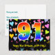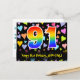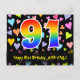 El frente de este diseño de tarjeta postal de cumpleaños emocionante, divertido y colorido presenta un gran número "91" con un patrón inspirado en gradiente de espectro de arcoíris, junto con el mensaje "Feliz cumpleaños 91", y un nombre de destinatario personalizado. La parte delantera tiene además un patrón vibrante y colorido de formas de corazones amorosos. La parte trasera presenta un mensaje de saludo de cumpleaños editable, o quizás podría borrarse y dejarse en blanco si se desea escribir un mensaje a mano. Una tarjeta postal de cumpleaños personalizable como esta podría ser una forma divertida de reconocer el cumpleaños número noventa y uno de alguien. Las tarjetas postales como esta también podrían usarse para invitar a los invitados a una fiesta de cumpleaños que se celebra para alguien que cumple 91 años. [~Z0000448]