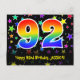 El frente de este diseño de tarjeta postal temática de cumpleaños emocionante, divertida y colorida presenta un gran número "92" con un patrón inspirado en el gradiente del espectro del arcoíris, junto con el mensaje "Feliz cumpleaños 92", y un nombre de destinatario editable. La parte delantera tiene además un patrón colorido y vibrante de formas de estrellas. La parte trasera presenta un mensaje de saludo de cumpleaños personalizado, o quizás podría estar despejado y en blanco si se va a escribir un mensaje a mano en su lugar. Una tarjeta postal de cumpleaños personalizable como esta podría ser una forma divertida de celebrar el cumpleaños número noventa y dos de alguien. Las tarjetas postales como esta también podrían usarse para invitar a los invitados a una fiesta de cumpleaños que se celebra para alguien que cumple 92 años. [~Z0000447]