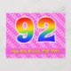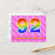 El frente de este divertido, alegre y animado diseño de tarjeta postal temática de cumpleaños presenta un gran número "92" con un patrón inspirado en el gradiente del espectro del arcoíris. También presenta el mensaje "Feliz cumpleaños número 92", y un nombre de destinatario personalizado. La parte delantera también tiene un patrón alegre de rayas rosadas oscuras y rosadas claras con formas de corazón. La parte trasera presenta un mensaje de saludo de cumpleaños personalizado, o quizás podría estar en blanco si se desea escribir un mensaje a mano. Una tarjeta postal de cumpleaños personalizable como esta podría ser una forma divertida de enviar un mensaje en celebración del cumpleaños número noventa y dos de alguien. Las tarjetas postales como esta también podrían usarse para invitar a los invitados a una celebración de cumpleaños que se celebra para alguien que cumple 92 años.